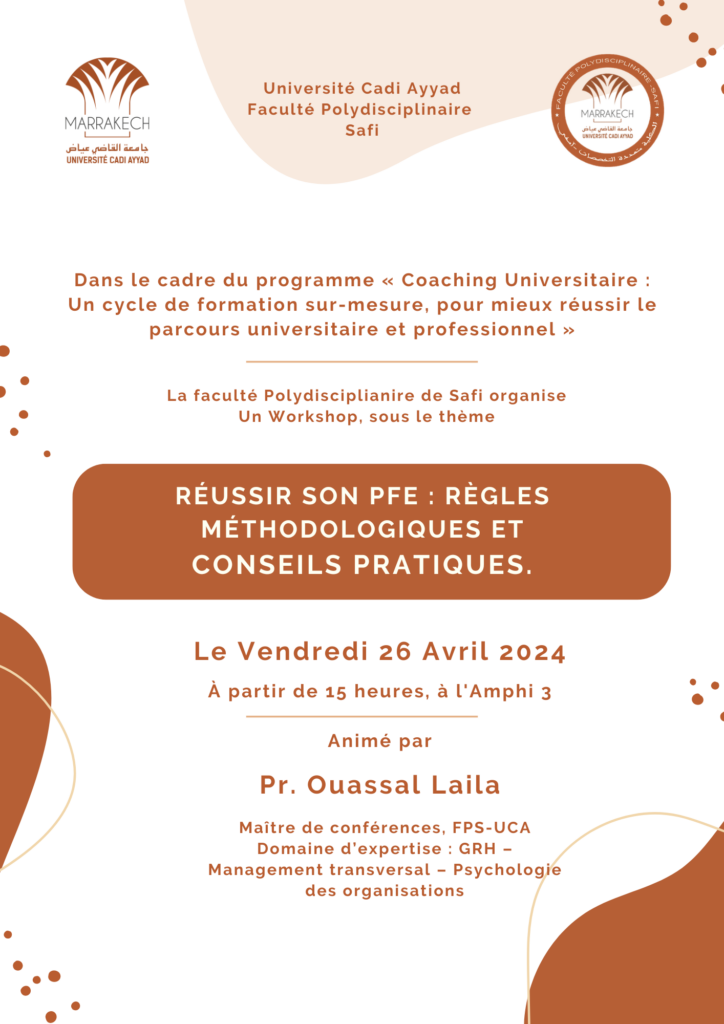 Dans le cadre du programme« Coaching Universitaire :Un cycle de formation sur-mesure, pour mieux réussir le parcours universitaire et professionnel » la faculté polydisciplinaire de Safi organise un Workshop, sous le thème : RÉUSSIR SON PFE : RÈGLES MÉTHODOLOGIQUES ET CONSEILS PRATIQUES. À partir de 15 heures, à l’Amphi 3.