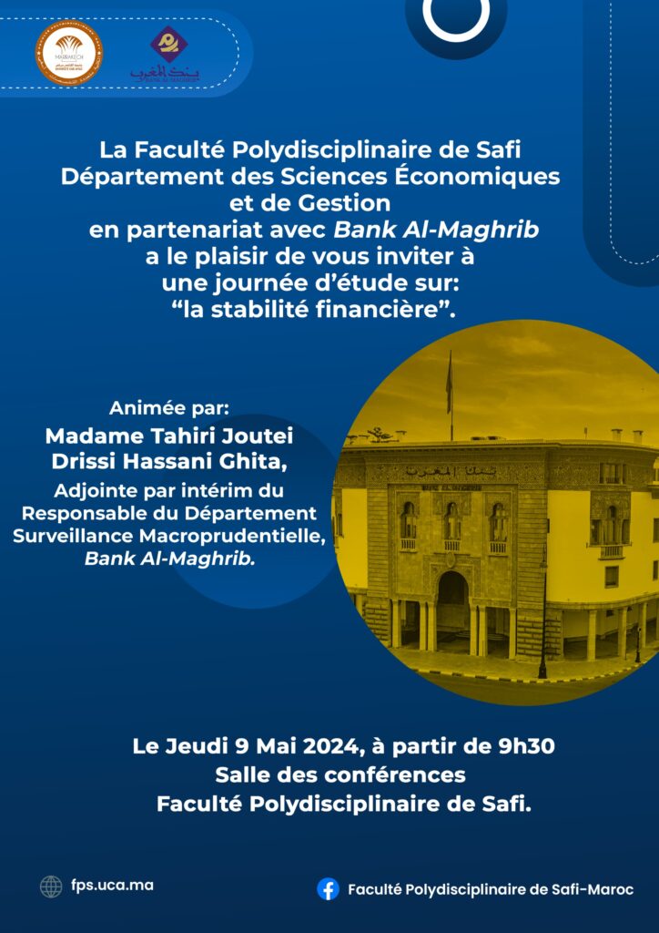 La faculté polydisciplinaire de Safi et le département des sciences économiques et de gestion en partenariat avec Bank Almaghreb a le plaisir de vous inviter à une journée d’étude sur la stabilité financère