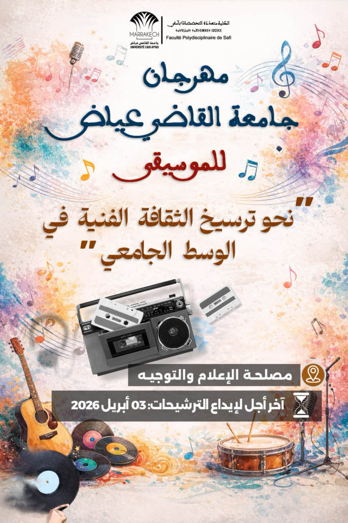 ي إطار تشجيع المواهب الفنية وترسيخ الثقافة الموسيقية داخل الوسط الجامعي، تنظم الكلية متعددة التخصصات بآسفي مهرجان جامعة القاضي عياض للموسيقى تحت شعار: