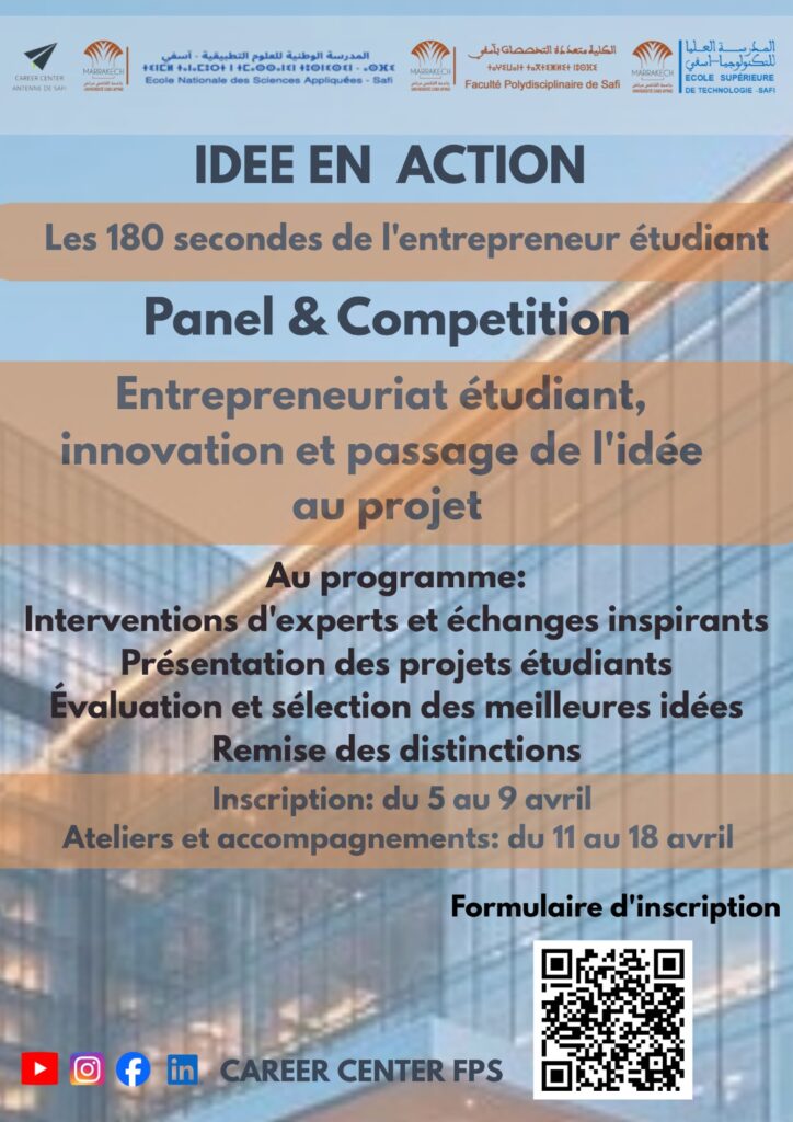 Le Career Center de l’Université Cadi Ayyad antenne Safi, en collaboration avec la Faculté Polydisciplinaire de Safi, l’ENSA Safi et l’EST Safi, lance une nouvelle édition dédiée à la valorisation de l’esprit entrepreneurial étudiant.